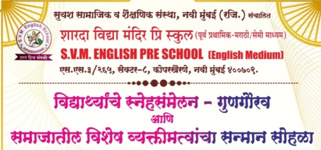 कोपरखैरणे : सुयश सामाजिक व शैक्षणिक संस्था, नवी मुंबई (रजि.) संचालित शारदा विद्या मंदिर प्री-स्कूल (पूर्व प्राथमिक मराठी/सेमी माध्यम) तसेच एस.व्ही.एम. इंग्लिश प्री स्कूल (इंग्रजी माध्यम) यांच्या वतीने विद्यार्थ्यांचे स्नेहसंमेलन, गुणगौरव समारंभ आणि समाजातील विशेष व्यक्तिमत्त्वांचा सन्मान सोहळा आयोजित करण्यात आला आहे. हा कार्यक्रम शुक्रवार, दि. १३ मार्च २०२६ रोजी सायंकाळी ५.०० ते ८.०० या वेळेत शेतकरी समाज संघटना हॉल, पहिला मजला, सेक्टर ४-ए, कोपरखैरणे, नवी मुंबई येथे पार पडणार आहे.