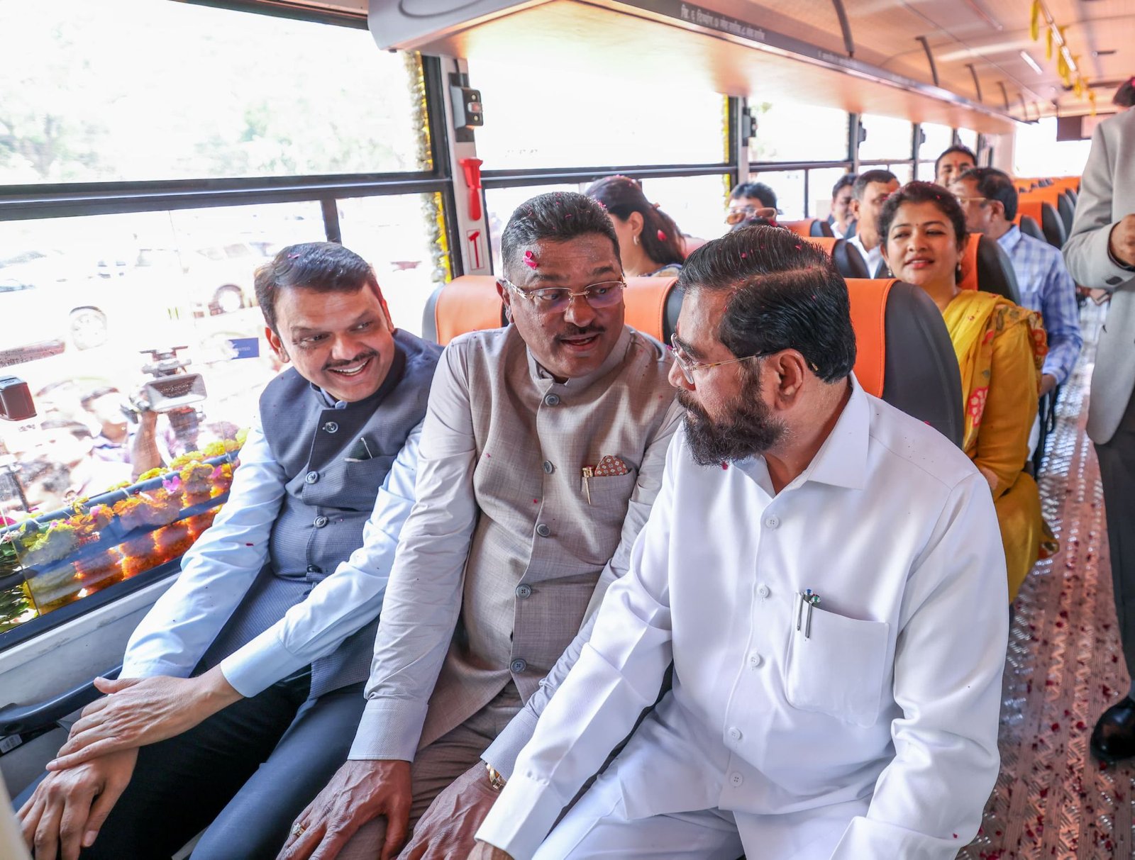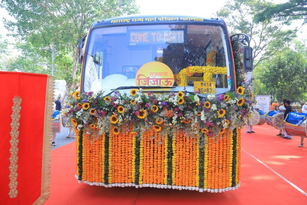 पूजन, फीत कापून झालेल्या शुभारंभानंतर मुख्यमंत्री फडणवीस, उपमुख्यमंत्री शिंदे, उपमुख्यमंत्री पवार आणि परिवहन मंत्री सरनाईक यांनी या बसमधून प्रवास करत नव्या युगाची सुरुवात प्रत्यक्ष अनुभवली. बसच्या अग्रभागी घोड्यावर आरूढ झालेल्या राजमाता जिजाऊंचा देखावा जणू इतिहासाला सजीव करत होता—त्या दृश्याने संपूर्ण सोहळ्याला एक अद्भुत, प्रेरणादायी आणि ऐतिहासिक आयाम प्राप्त झाला.