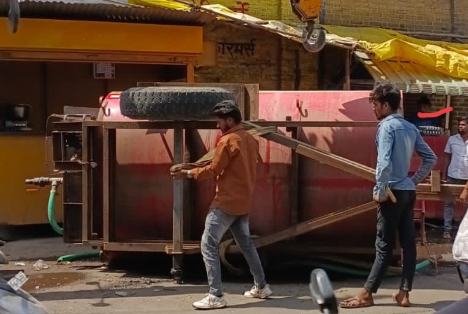 फोटो- साताऱ्या शहरातील राधिका रस्त्यावरील आडवा झालेल्या टँकर….