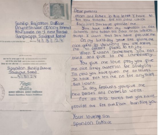 स्पंदनने आपल्या पत्रात आई-वडिलांनी आजवर पुरवलेल्या सोयी-सुविधा, चांगल्या शाळेतील प्रवेश, सणासुदीला मिळणारे नवे कपडे आणि वेळोवेळी सहलीला नेऊन दिलेला आनंद याबद्दल मनापासून आभार मानले आहेत. “तुम्ही मला कधीही ‘नाही’ म्हणालात नाही, माझ्यासाठी नेहमी प्रार्थना केली, त्याबद्दल धन्यवाद,” अशा शब्दांत त्याने आपल्या भावना मांडल्या. एका लहान मुलाने पालकांच्या कष्टांची इतकी प्रगल्भतेने जाणीव ठेवणे, ही उपस्थित सर्वांसाठी कौतुकाची बाब ठरली आहे.