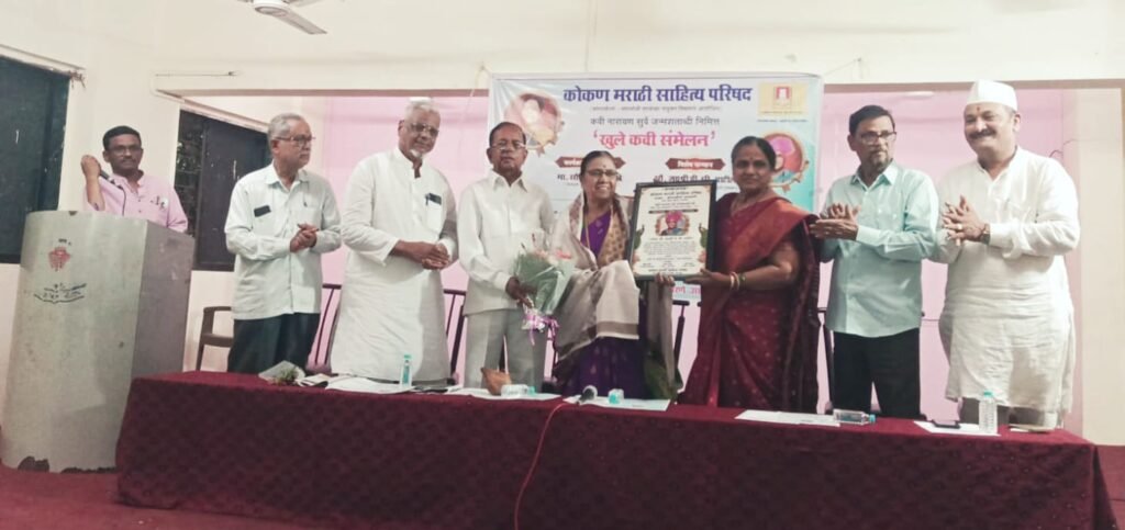 नवी मुंबई : कोकण मराठी साहित्य परिषदेच्या कोपरखैरणे व घणसोली शाखेच्या संयुक्त विद्यमाने थोर कवी नारायण सुर्वे यांच्या जन्मशताब्दी वर्षाचे औचित्य साधून कोपरखैरणे येथील ज्ञान विकास विद्यालयात भव्य ‘खुले कवी संमेलन’ शनिवारी २५ एप्रिल रोजी मोठ्या उत्साहात संपन्न झाले. महाराष्ट्र शासनाचा ‘ज्ञानज्योती सावित्रीबाई फुले पुरस्कार’ प्राप्त झाल्याबद्दल सौ. जयश्रीताई पी. सी. पाटील यांचा या कार्यक्रमात विशेष नागरी सत्कार करण्यात आला.