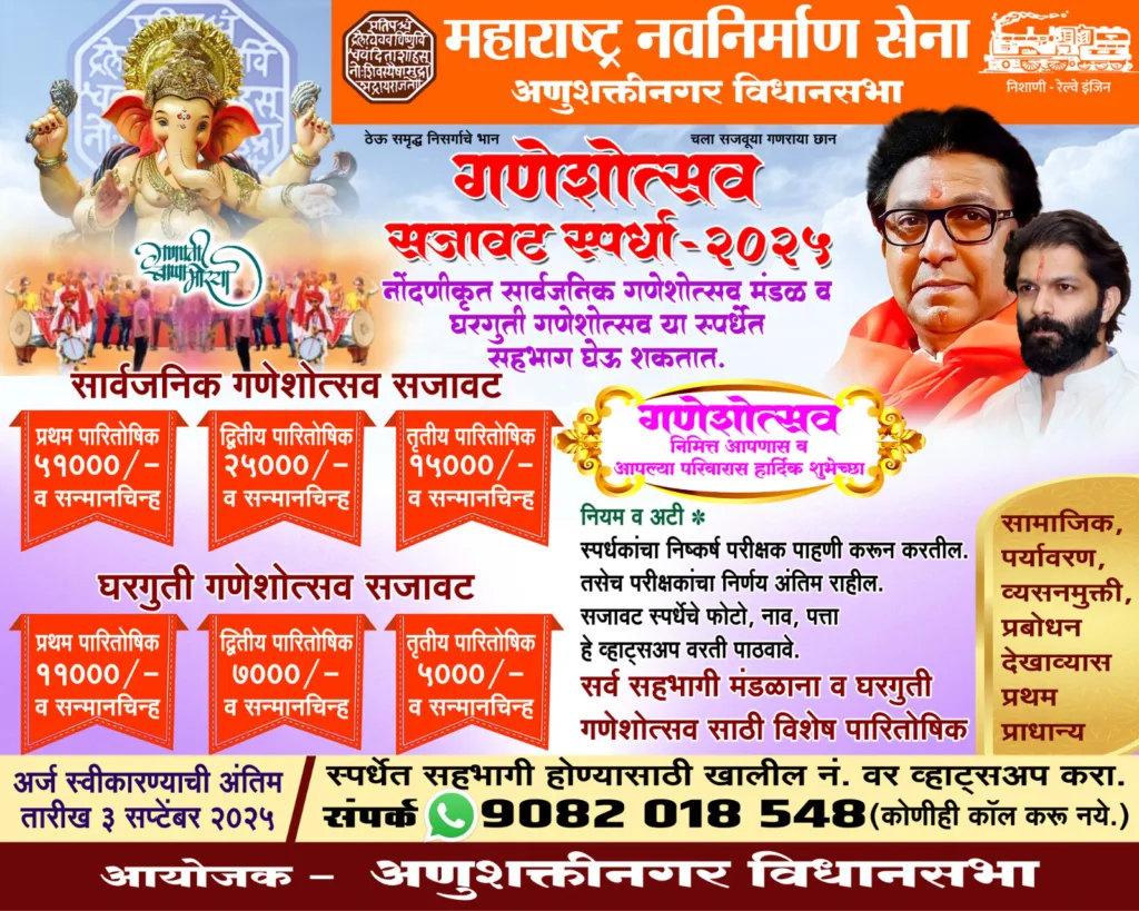 प्रतिनिधी : अनुशक्ती नगर विधानसभा क्षेत्रात सार्वजनिक तसेच घरगुती गणेशोत्सव सजावट स्पर्धेचे आयोजन करण्यात आले असून, या उपक्रमाला नागरिकांचा उत्स्फूर्त