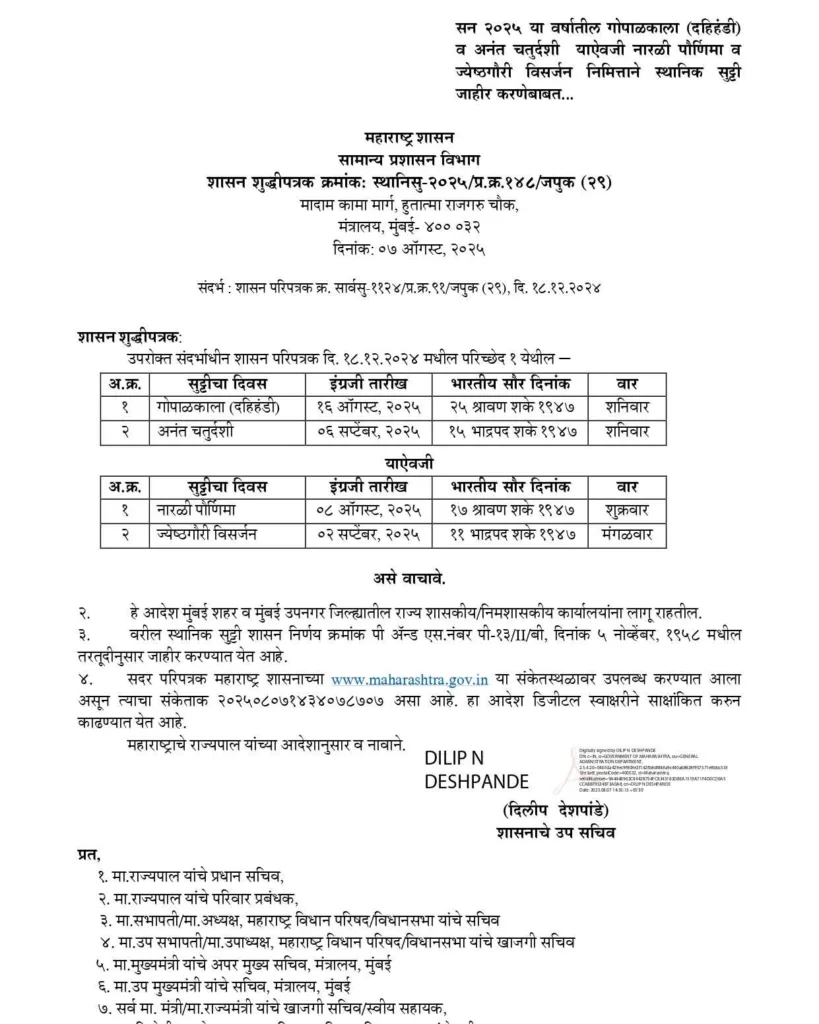 प्रतिनिधी : मुंबई शहर व उपनगर जिल्ह्यातील राज्य शासकीय व निमशासकीय कार्यालयांना सन २०२५ या वर्षात गोपाळकाला (दि. १६ ऑगस्ट) […]
