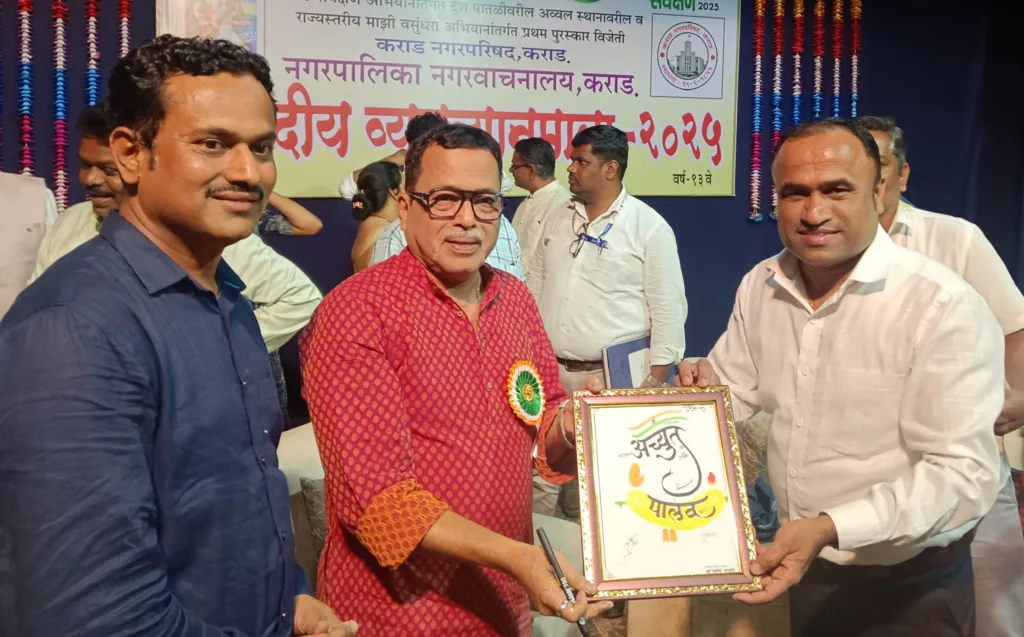तळमावले/वार्ताहर : आंतरराष्ट्रीय ख्यातीचे सुलेखनकार पद्मश्री अच्युत पालव यांना अक्षरगणेशाकार संदीप डाकवे यांनी त्यांच्या नावात रेखाटलेल्या अक्षर गणेशाची कलाकृती भेट