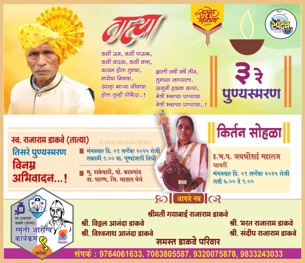 तळमावले/वार्ताहर : पाटण तालुक्यातील डाकेवाडी (काळगांव) येथील स्व.राजाराम डाकवे (तात्या) यांच्या तृतीय पुण्यस्मरणानिमित्त मंगळवार दि.9 सप्टेंबर, 2025 रोजी सकाळी 10.00
