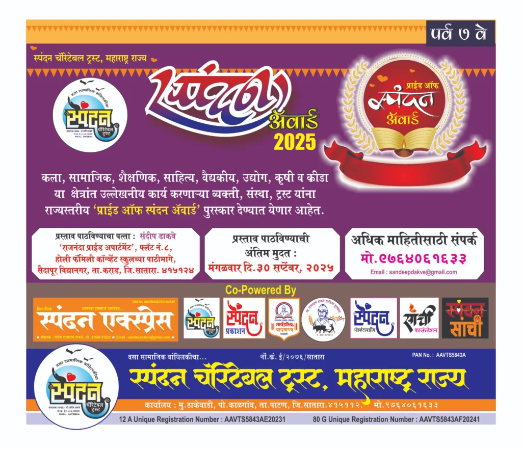 तळमावले/वार्ताहर : पाटण तालुक्यातील डाकेवाडी (काळगांव) येथील स्पंदन चॅरिटेबल ट्रस्ट महाराष्ट्र राज्य यांच्यावतीने विविध क्षेत्रात आदर्श असलेल्या आणि सामाजिक जडणघडणीसाठी