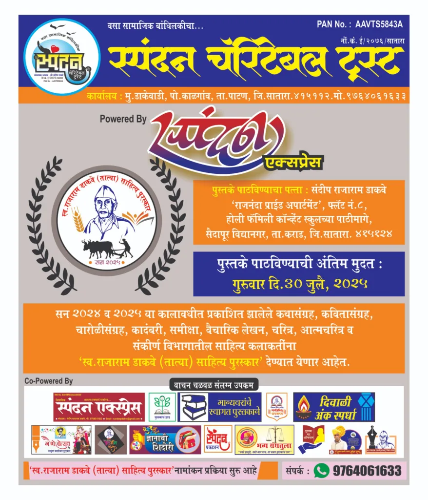 तळमावले/वार्ताहर : पाटण तालुक्यातील डाकेवाडी (काळगांव) येथील स्पंदन चॅरिटेबल ट्रस्टच्यावतीने उत्कृष्ट वाङ्मय निर्मितीसाठी राज्यस्तरीय स्व.राजाराम डाकवे (तात्या) साहित्य पुरस्कार देण्यात