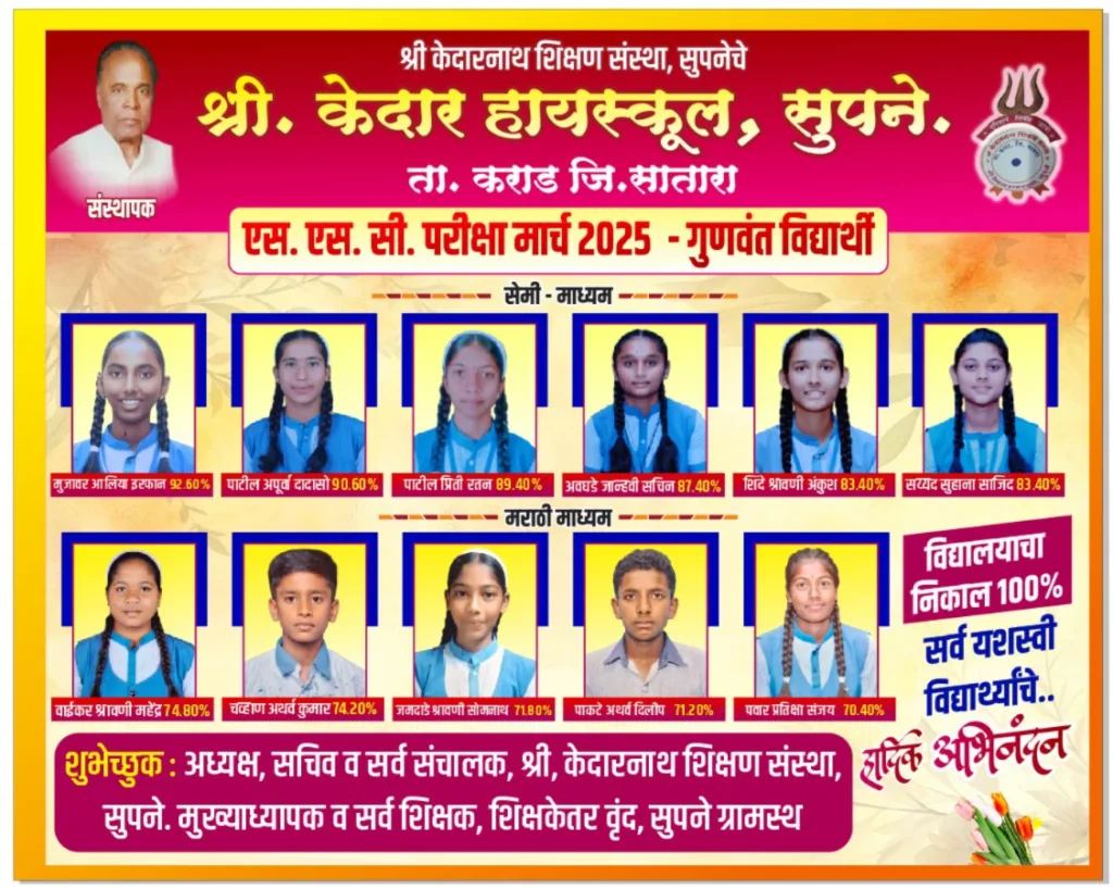 कराड(विजया माने) : श्री केदारनाथ शिक्षण संस्थेचे श्री केदार हायस्कूल सुपने दहावीच्या परीक्षेत उज्ज्वल यश मिळवले. विद्यालयाने १००% निकालाची परंपरा