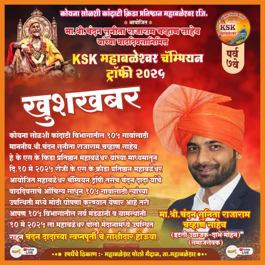 महाबळेश्वर, ६ मे (प्रतिनिधी – नितीन गायकवाड): मोहनदाभे गावचे सुपुत्र, युवा यशस्वी उद्योजक आणि के.एस.के. क्रीडा प्रतिष्ठान महाबळेश्वरचे आधारस्तंभ आदरणीय