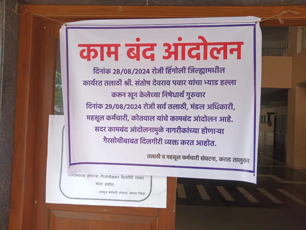 प्रतिनिधी(प्रताप भणगे) : हिंगोली जिल्ह्यातील कार्यरत तलाठी संतोष देवराव पवार यांच्यावर भ्याड हल्ला करून खून केल्याच्या निषेधार्थ गुरुवारी दिनांक २९