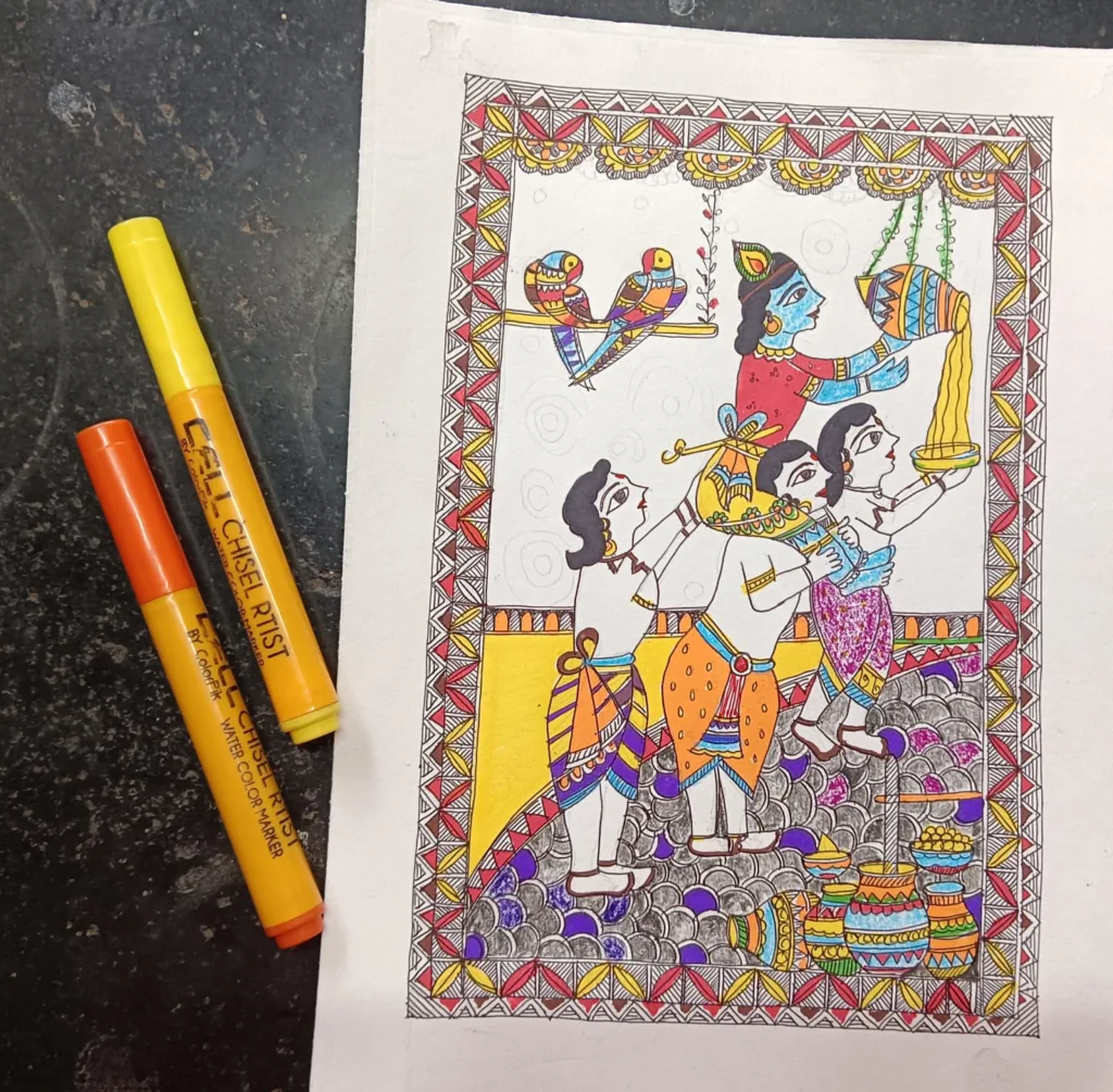 तळमावले/वार्ताहर : नेहमीच वैविध्यपूर्ण कलाकृती साकारणारे पाटण तालुक्यातील डाकेवाडी (काळगांव) येथील शेतीमित्र डाॅ.संदीप डाकवे यांनी गोकुळअष्टमीचे औचित्य साधत मधुबनी चित्रशैलीमध्ये