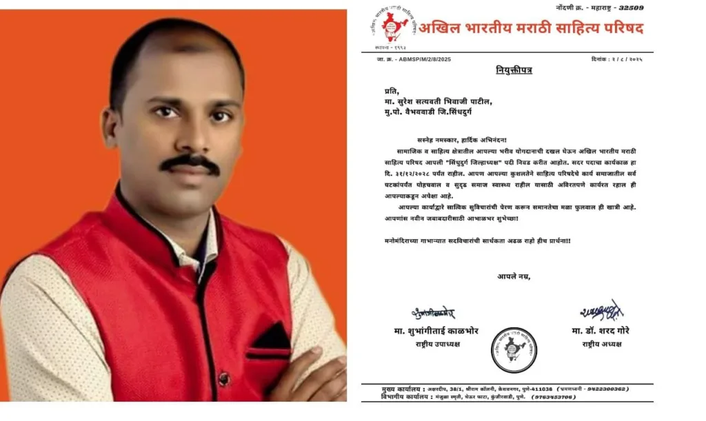 मुंबई (पी.डी. पाटील)- मराठी साहित्य क्षेत्रातील अग्रणी असलेल्या अखिल भारतीय मराठी साहित्य परिषदेच्या सिंधुदुर्ग जिल्हाध्यक्षपदी सुप्रसिद्ध साहित्यिक डॉ सुरेश भिवाजी