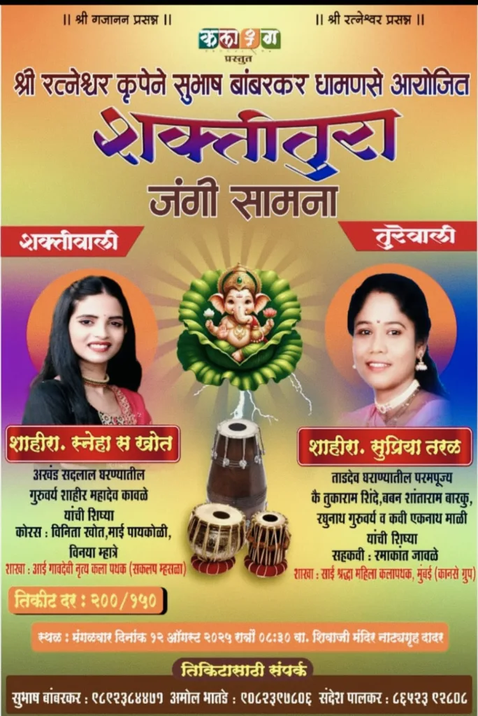 मुंबई (शांताराम गुडेकर) : कलारंग प्रस्तुत श्री रत्नेश्वर कृपेने सुभाष बांबरकर धामणसे आयोजित शक्तीतुरा जंगी सामना मुंबई येथे होणार आहे.