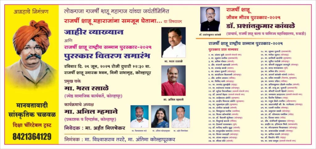 कोल्हापूर : राजर्षी शाहू महाराज जयंतीनिमित्ताने २९ जून २०२५ रोजी दुपारी १२.३० वा. राजर्षी शाहू स्मारक भवन, कोल्हापूर येथे भव्य पुरस्कार समारंभाचे आयोजन करण्यात आले आहे. दिक्षा चॅरिटेबल ट्रस्ट व मानवतावादी सांस्कृतिक चळवळ यांच्या संयुक्त विद्यमाने हा कार्यक्रम होणार आहे.