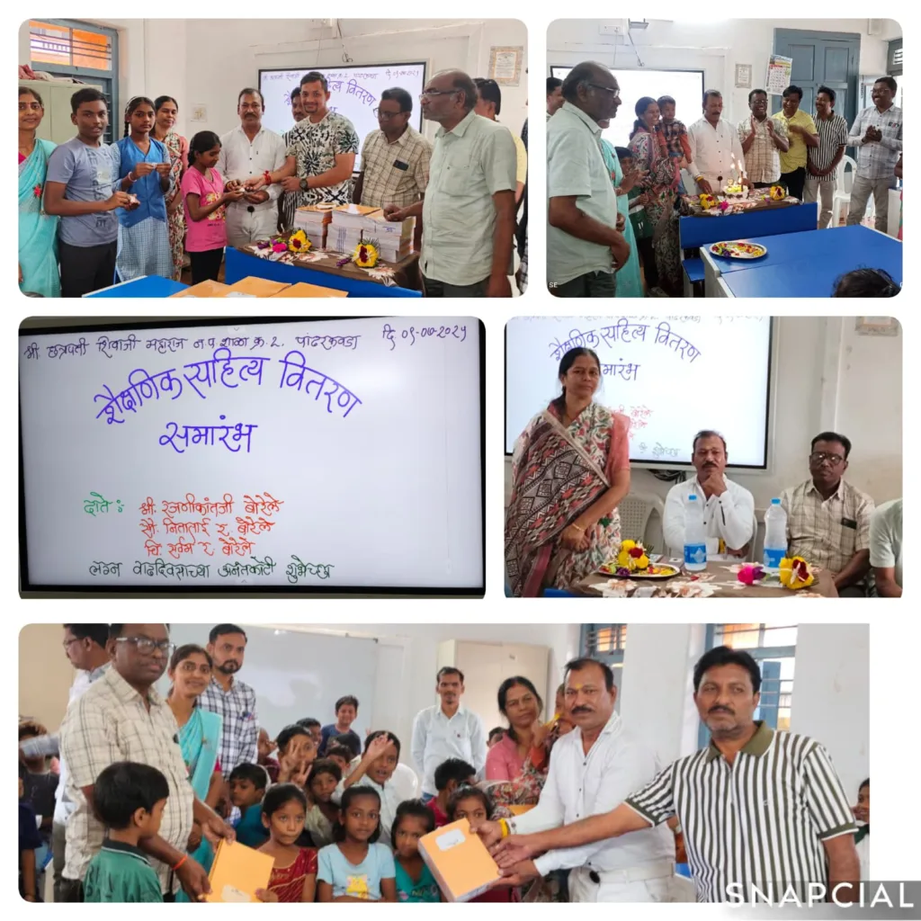 यावेळी रजनीकांत बोरेले,नीताताई मडावी (बोरेले) उमेश बोरेले,गणेश सिंघानिया,वासुदेव राठोड (जरंग), स्मित झाजरीया अक्षय पीपलवा, शुभम (बंटी ) बोरेले,विक्रांत बोरेले या सर्वांच्या शुभ हस्ते नोट बुक संच, चांदीचे शिक्के, वाटप करण्यात आले आहे तर मुख्याध्यापक सातुरवार सर, माजी,मुख्याध्यापक श्रगंगशेट्टीवर सर,काकडे सर, लोहवे सर,सलाम सर,कु.राधिका आयलेनिवार मैडम, वर्षा तलमले मैडम,मंमता पारधे मैडम यांची प्रामुख्याने उपस्थिति होती हे विशेष