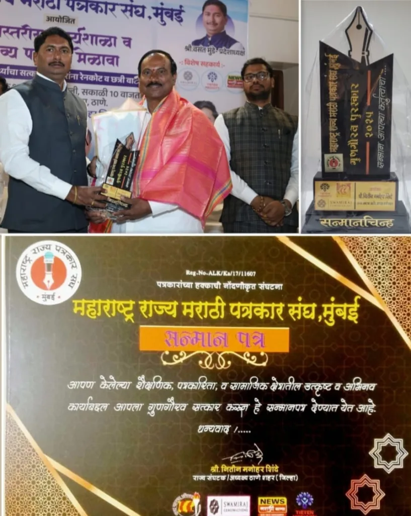 हा पुरस्कार पत्रकार संघाचे प्रदेशाध्यक्ष वसंतराव मुंडे यांच्या हस्ते प्रदान करण्यात आला. यावेळी व्यासपीठावर राज्य कार्याध्यक्ष प्रवीण सपकाळे, सरचिटणीस जगदीश सोनवणे, राज्य उपाध्यक्ष डॉ. दिलीप कोठावदे, कोकण विभाग संघटक अरुण बिराजदार, राज्य सल्लागार प्रमोद इंगळे, ठाणे जिल्हाध्यक्ष शंकर करडे, नवी मुंबई जिल्हाध्यक्ष राजेंद्र बोडके, आणि कार्यक्रमाचे आयोजक व ठाणे शहर जिल्हाध्यक्ष नितीन मनोहर शिंदे आदी मान्यवर उपस्थित होते.