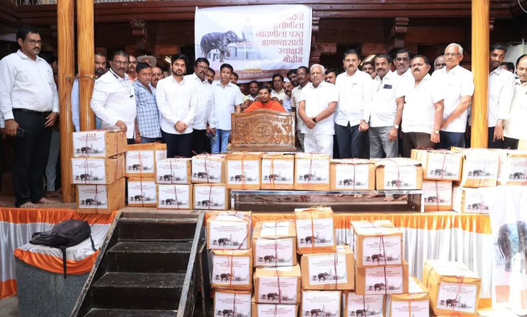 कोल्हापूर : महाराष्ट्र व कर्नाटकातील लाखो भाविकांच्या श्रद्धेचे प्रतीक असलेल्या “महादेवी” हत्तीणीला नांदणी मठाकडे परत आणावे, अशी मागणी जोर धरू लागली आहे. या जनभावनेचा आवाज बुलंद करत २ लाख ४ हजार ४२१ भक्तांनी स्वाक्षरी केलेले फॉर्म आज नांदणी येथे स्वस्तिश्री जिनसेन भट्टारक पट्टाचार्य महास्वामीजी यांच्या हस्ते विधीवत पूजन करून राष्ट्रपतींपर्यंत पोहोचविण्याचा संकल्प करण्यात आला.