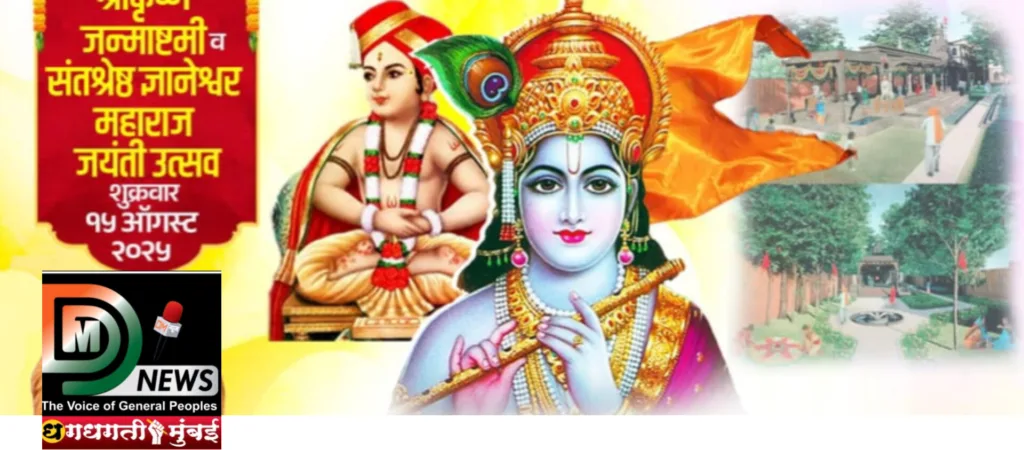 प्रतिनिधी : गोकुळ अष्टमी आणि संतश्रेष्ठ श्री ज्ञानेश्वर महाराज यांची जयंती हे वर्ष सप्तशतकोत्तर सुवर्ण महोत्सवी वर्ष म्हणून साजरे करण्यात येत आहे. या निमित्ताने दिनांक १५ ऑगस्ट २०२५ रोजी श्री संत ज्ञानेश्वर महाराज मंदिर, नवीन शासकीय वसाहत, बांद्रा पूर्व, मुंबई – ५१ येथे विविध धार्मिक कार्यक्रमांचे आयोजन करण्यात आले आहे. प्रमुख मार्गदर्शक – गुरुवर्य ह.भ.प. श्री रामेश्वर महाराज शास्त्री, संस्थापक अध्यक्ष
