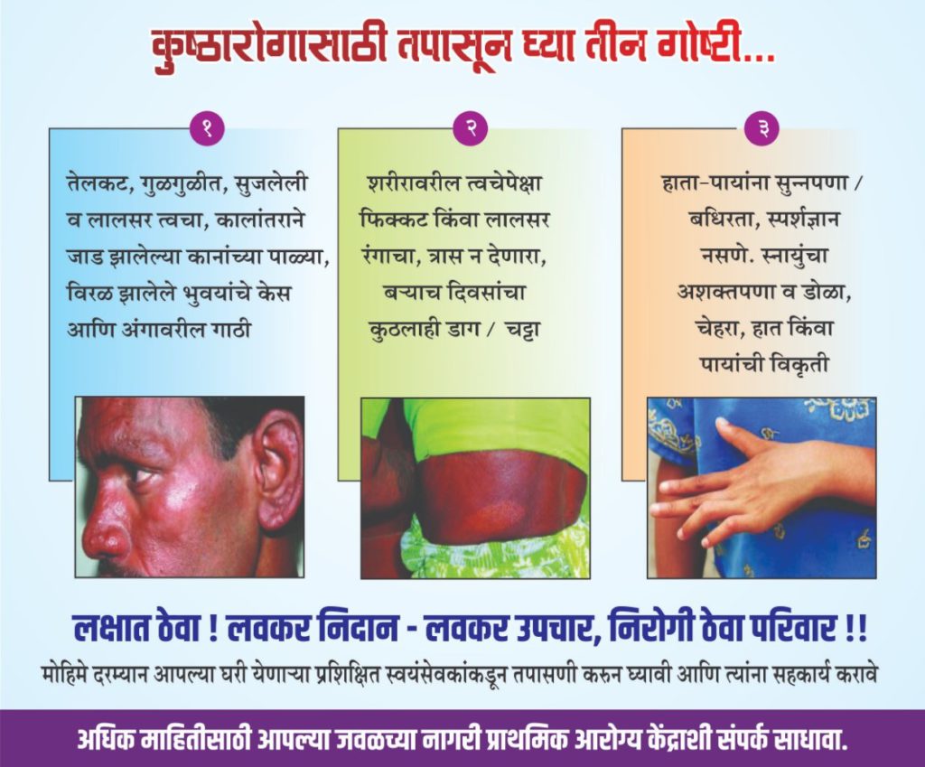 प्रत्येक पथकामध्ये एक महिला व एक पुरुष कर्मचारी असणार आहे. प्रत्येक घरातील महिलांची तपासणी महिला कर्मचाऱ्यांमार्फत आणि पुरुषांची तपासणी पुरुष कर्मचाऱ्यांमार्फत करण्यात येणार आहे. कुष्ठरोगाकरिता त्वचेवर फिकट/लालसर बधीर चट्टा, त्याठिकाणी घाम न येणे, जाड व बधीर तेलकट/चकाकणारी त्वचा, त्वचेवर गाठी असणे, कानाच्या पाळया जाड होणे, भुवयांचे केस विरळ होणे, डोळे पूर्ण बंद न करता न येणे अशा प्रकारची लक्षणे विचारुन तपासणी केली जाणार आहे. यामध्ये कुष्ठरोगाची लक्षणे आढळल्यानंतर वैदयकिय अधिकारी यांच्याकडे निदानाकरीता संदर्भित करण्यात येणार आहे.