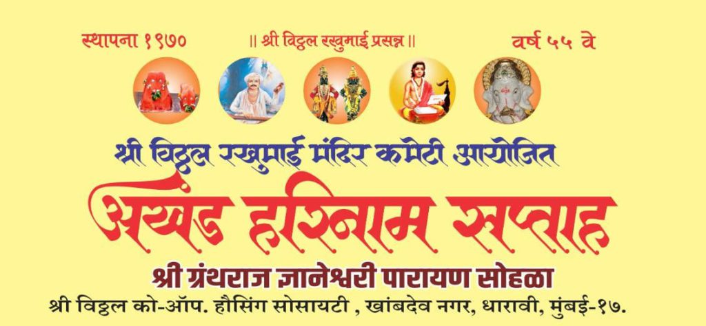 धारावी(संतोष लिंबोरे) : धारावीतील खांबदेव नगर येथील श्री विठ्ठल-रखुमाई मंदिरात १८ नोव्हेंबर ते २४ नोव्हेंबरदरम्यान अखंड हरिनाम सप्ताहाचे आयोजन करण्यात आले आहे. ह.भ.प. शिवाजी महाराज जगताप यांच्या नेतृत्वाखाली आणि श्री दामोदर खोपडे अण्णा यांच्या मार्गदर्शनाखाली यंदा या धार्मिक उपक्रमाचे ५५ वे वर्ष पूर्ण होत आहे.