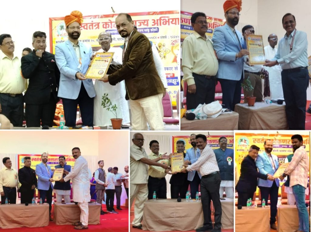 मुंबई(सौ. मनस्वी मनवे) : सामाजिक कार्यकर्ते जेष्ठ नागरिक पत्रकार, गुणवंत कामगार पुरस्कार विजेते श्री. श्रीराम विष्णू वैद्य,पत्रकार/सामाजिक कार्यकर्ते मोहन कदम, शांताराम गुडेकर, केतन भोज, दीपक फणसळकर यांना स्वतंत्र कोकण राज्य अभियानातर्फे पत्रकारिता /सामाजिक कार्य क्षेत्रात उत्कृष्ट योगदानाबद्दल “कोकणरत्न पदवी-२०२५ पुरस्काराने गौरविण्यात आले.हा पुरस्कार प्रदान सोहळा १३ डिसेंबर २०२५ रोजी संध्याकाळी ४ वाजता मुंबई मराठी पत्रकार भवन, आझाद मैदान शेजारी, मुंबई येथे मोठ्या उत्साहात संपन्न झाला.स्वतंत्र कोकण राज्य अभियानातर्फे मुंबईपासून सिंधुदुर्गपर्यंत कोकणातील निवडक व्यक्तींना या पुरस्काराने सन्मानित करण्यात आले. स्वतंत्र कोकणराज्य अभियान तर्फे प्रदान करण्यात येणाऱ्या “कोकणरत्न” या मानाच्या पदवीसाठी यंदा उल्लेखनीय सामाजिक कार्य करणाऱ्या व्यक्तींची निवड करण्यात आली आहे. कोकणच्या सर्वांगीण विकासासाठी आणि सामाजिक प्रबोधनासाठी कार्यरत असलेल्या विविध मान्यवरांचा गौरव करणारा हा अतिशय स्तुत्य