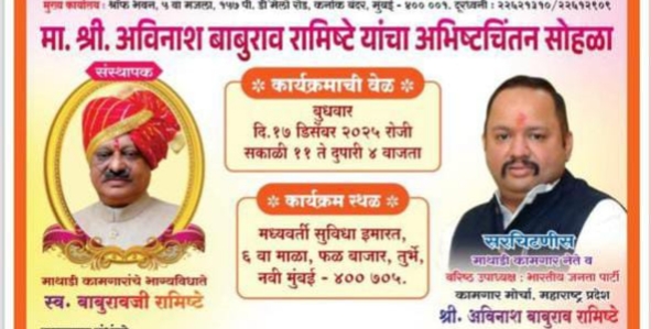 नवी मुंबई(अमोल पाटील) : ग्रामीण भागातील सामान्य कुटुंबातून मुंबई स्थित ठिकाणी कामगारांच्या हितासाठी आयुष्य वेचले व अन्यायाविरुद्ध आवाज उठवणाऱ्या माथाडीचे कैवारी श्री अविनाश बाबुराव रामिस्टे (माथाडी कामगार नेते व वरिष्ठ उपाध्यक्ष भारतीय जनता पार्टी) यांचा वाढदिवस अभिष्टचिंतन सोहळा बुधवार दिनांक १७ डिसेंबर २०२५ रोजी सकाळी ११ ते दुपारी ४ वाजेपर्यंत संघटनेच्या मध्यवर्ती सुविधा इमारत ,सहावा मजला, एन. पी .एम .सी.फळ मार्केट ,तुर्भे ,नवी मुंबई येथे संपन्न होणार आहे. या कार्यक्रमासाठी अनेक दिग्गज नेते व सामाजिक कार्यकर्ते उपस्थित राहणार आहेत. त्याचबरोबर युनियनचे सर्व पदाधिकारी कार्यकर्ते मुकादम कामगार व कर्मचारी वर्ग उपस्थित राहणार आहे.
