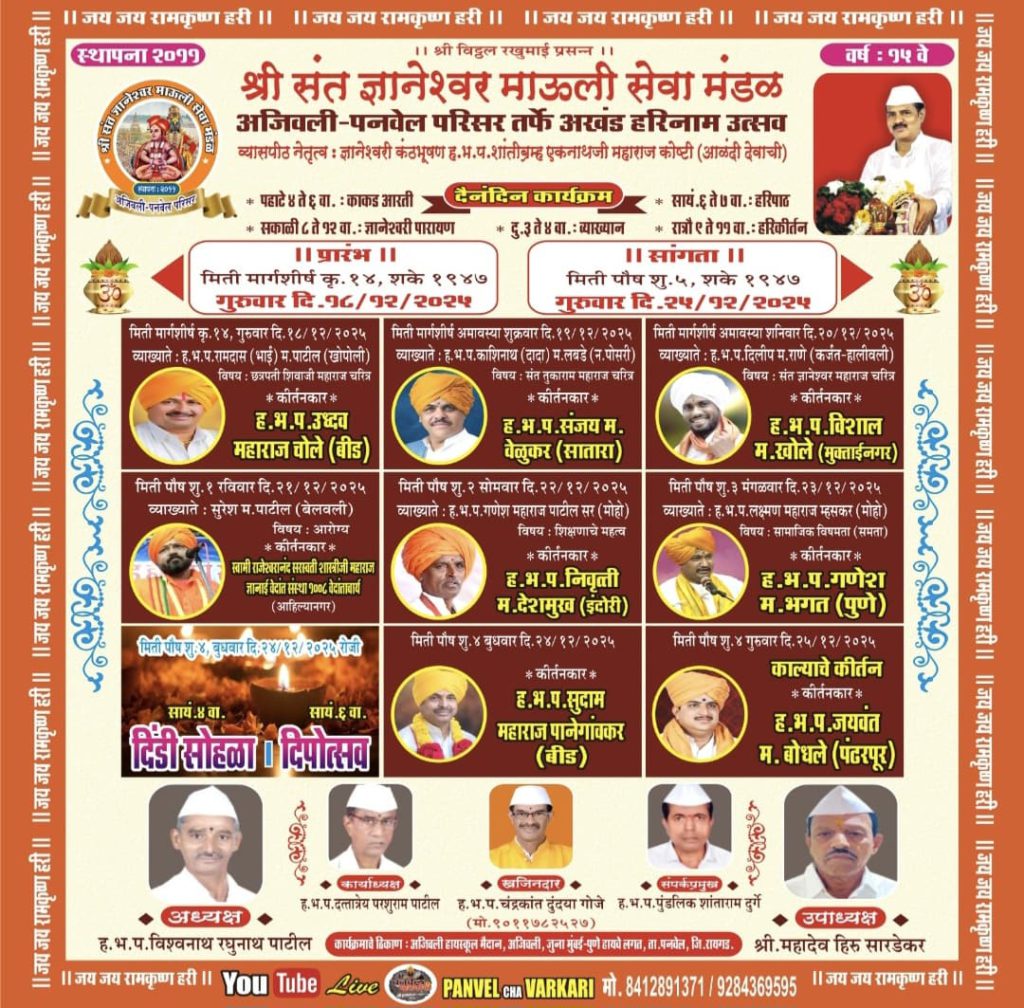 पनवेल(अमोल पाटील) : आजीवली तालुका पनवेल येथे श्री संत ज्ञानेश्वर माऊली सेवा मंडळ यांच्या वतीने दिनांक १८ १२ २०२५ रोजी प्रारंभ होत असून त्याची सांगता २५ १२ २०२५ रोजी होत आहे. श्री संत ज्ञानेश्वर माऊली सेवा मंडळ पंधराव्या वर्षात पदार्पण करत आहे. पनवेल परिसरातील या अखंड हरिनाम उत्सवामध्ये भक्ती, नामस्मरण आणि सामूहिक उपासनेचा एक पवित्र सोहळा आहे.अखंड हरिनाम उत्सवात हरि, विठ्ठल, राम, कृष्ण यांसारख्या भगवंतांच्या नामाचा २४ तास (किंवा अधिक काळ) अखंड जप व कीर्तन केले जाते. या काळात नामस्मरण थांबत नाही—गावकरी, भक्त मंडळी आलटून-पालटून हरिनाम घेतात.