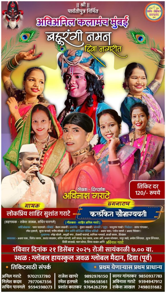 कलाकार-अक्षय परब,निलेश कदम,प्रशांत कातकर, सचिन पानगले, सनी जाधव,यश यादव,अजय ओर्पे, अक्षय सोलकर,मयूर खाडे,अमोल लिंगायत,सुरज लिंगायत,विकी काताळे,पवन धोपट,विनय वाळंज गणेश दवंडे सर आणि अविनाश गराटे असून हा कार्यक्रम पहायला विसरू नका.संपूर्ण फॅमिली एकत्र बसून पहावा असा अप्रतिम कार्यक्रम म्हणजेच अविअनिल कलामंच यांचे लोकप्रिय बहुरंगी नमन. दिनांक २१ डिसेंबर २०२५ रोजी सायंकाळी ७ वाजता – ग्लोबल हायस्कूल ग्लोबल मैदान- दिवा पूर्व येथे सादरीकरण होणार आहे.तिकीट दर फक्त-१२०/- आहे.तरी रसिकहो आपण या कार्यक्रमला मोठया संख्येने उपस्थित राहून कोकणच्या लोक कलेचा आनंद घ्यावा अशी विनंती अविअनिल कलामंच सर्व सभासदतर्फे करण्यात आली आहे. प्रथम येणाऱ्यास प्रथम प्राधांन्य दिले जाणार असून कार्यक्रम बाबत अधिक माहिती व तिकीट साठी अनिल गराटे – ९७०२१३७७८०,निलेश कदम-७९७७०६७३५६,सचिन पानगले-९५९४५९८०७३,राजेश खापरे – ९८९२९७६१५०, रमेश हतपले-९६१९६५८५६१,प्रशांत कातकर -९७६४2 ६२७९९,सागर गांगरकर -९८५०९३७७८३