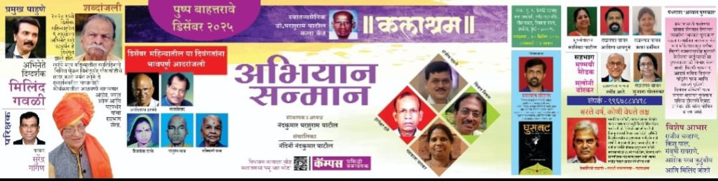 ‘ या संस्थेच्या वतीने प्रत्येक महिन्याला ‘अभियान सन्मान’ हा उपक्रम राबवला जातो. मंगळवार ३० डिसेंबर सायंकाळी ४ वाजता. पु. ल. देशपांडे महाराष्ट्र कला अकादमी, रवींद्र नाट्य मंदिर, चौथा मजला येथे होणारे हे ७२ वे पुष्प आहे. डिसेंबर महिन्यात दिवंगत झालेल्या प्रज्ञावंतांचे स्मरण आणि तसे कार्य करणाऱ्या गुणीजनांना ‘दखलपत्र’ देऊन त्यांचा सन्मान करणारा हा उपक्रम असतो. ही संस्था स्वातंत्र्यसैनिक डॉ. पशुराम पाटील कला केंद्राच्या अंतर्गत कार्य करते. अभिनेते, दिग्दर्शक मिलिंद गवळी यांच्या उपस्थितीत हा कार्यक्रम होणार आहे. यात प्रामुख्याने लेखक, साहित्यिक आदिनाथ हरवंदे, अभिनेते राजशेखर, आदर्श गृहिणी वैजयंता डाळे, आदर्श श्रमिक पांडुरंग परब, आदर्श गृहिणी रुक्मिणी परब यांचे स्मरण होणार आहे. यांच्या नावाचे ‘दखलपत्र’ लेखक संजीव पाध्ये, अभिनेते विजय निकम, आदर्श गृहिणी चंद्रकला वास्कर, कामगार सुपुत्र ढोलकीसम्राट ज्ञानेश्वर ढोरे यांना दिले जाणार आहेत. हेच निमित्त घेऊन प्रत्येक महिन्याला महाराष्ट्राचे नाव उज्वल करणाऱ्या प्रज्ञावंतांना प्रत्यक्ष कलाकृती सादर करून आदरांजली वाहिली जाते. डिसेंबर महिन्यातील स्मृतिदिनाचे निमित्त घेऊन अभिनेते रवी पटवर्धन यांना ‘शब्दांजली’ वाहिली जाणार आहे. त्यासाठी गप्पागोष्टीचे सादरकर्ते जयंत ओक हे येणार आहेत. प्रत्येक महिन्याला अभिनव स्पर्धा घेण्यात येते. यंदा सुद्धा ६६ वी स्पर्धा ‘सरले वर्ष, कोणी वेधले लक्ष’ ही स्पर्धा घेण्यात आली होती. ही स्पर्धा सामाजिक कार्यकर्ते, वादक कलाकार चंद्रकांत चव्हाण यांच्या स्मृतिदिनाच्या निमित्ताने घेण्यात आली होती. त्यांचे चिरंजीव अभिनेते, दिग्दर्शक संजीव चव्हाण यांचे मार्गदर्शन या स्पर्धेला लाभले होते. ज्येष्ठ पत्रकार सुरेंद्र गांगण यांनी स्पर्धेचे परिक्षक म्हणून काम पाहिले. सानिका पाटील, आदित्य धायगुडे, ऋचा हर्डीकर, रवींद्र आटे, सुजाता गोलतकर, हेमांगीनी दळवी, मृग्मयी मोडक सलोनी बोरकर आदींचा या कार्यक्रमामध्ये सहभाग असणार आहे. विशाल यादव हे संस्थेचे सन्माननीय सदस्य आहेत. ‘घुसमट’ आकांत अंतर्गत वादळाचा हे त्यांचे स्वअनुभवावरती लिहिलेले पुस्तक आहे. त्याचे प्रकाशन या सोहळ्यात होणार आहे. पत्रकार नंदकुमार पाटील हे या संस्थेचे संस्थापक, अध्यक्ष आहेत. नंदिनी पाटील या संचालिका आहे.