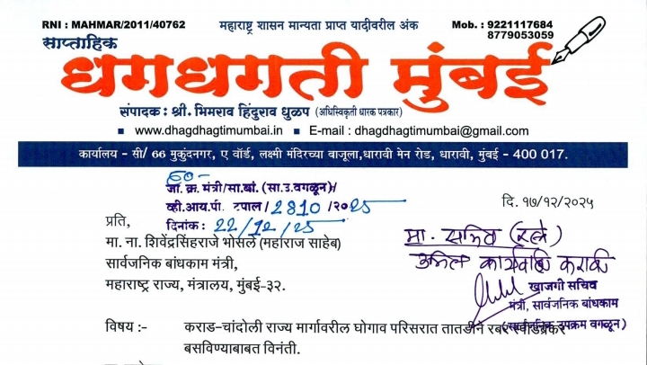 या पार्श्वभूमीवर धगधगती मुंबईचे संपादक व महाराष्ट्र शासन मान्यताप्राप्त पत्रकार भीमराव धुळप यांनी राज्याचे सार्वजनिक बांधकाम मंत्री शिवेंद्रसिंहराजे भोसले यांच्याकडे निवेदन सादर केले होते. या निवेदनाची तात्काळ दखल घेत मंत्री महोदयांनी संबंधित विभागाला त्वरित व उचित कार्यवाही करण्याच्या सूचना दिल्या आहेत.