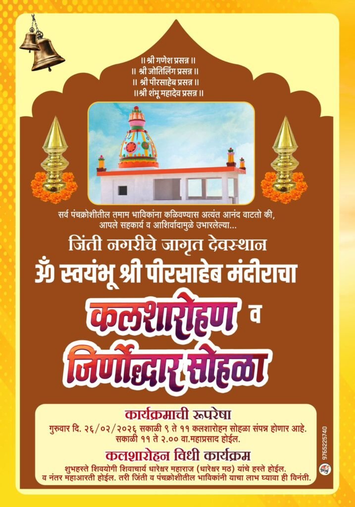 तब्बल ३० दशकांनंतर मंदिराचा भव्य कलशारोहण व जीर्णोद्धार सोहळा गुरुवार, दिनांक २६ फेब्रुवारी २०२६ रोजी जिंती (ता. कराड) येथे अत्यंत उत्साहपूर्ण व भक्तिमय वातावरणात पार पडणार आहे. मंदिरात विविध धार्मिक विधी, पूजा-अर्चा आणि मंत्रोच्चारांच्या गजरात कार्यक्रम होणार असून परिसरात सध्या उत्साहाचे वातावरण आहे.