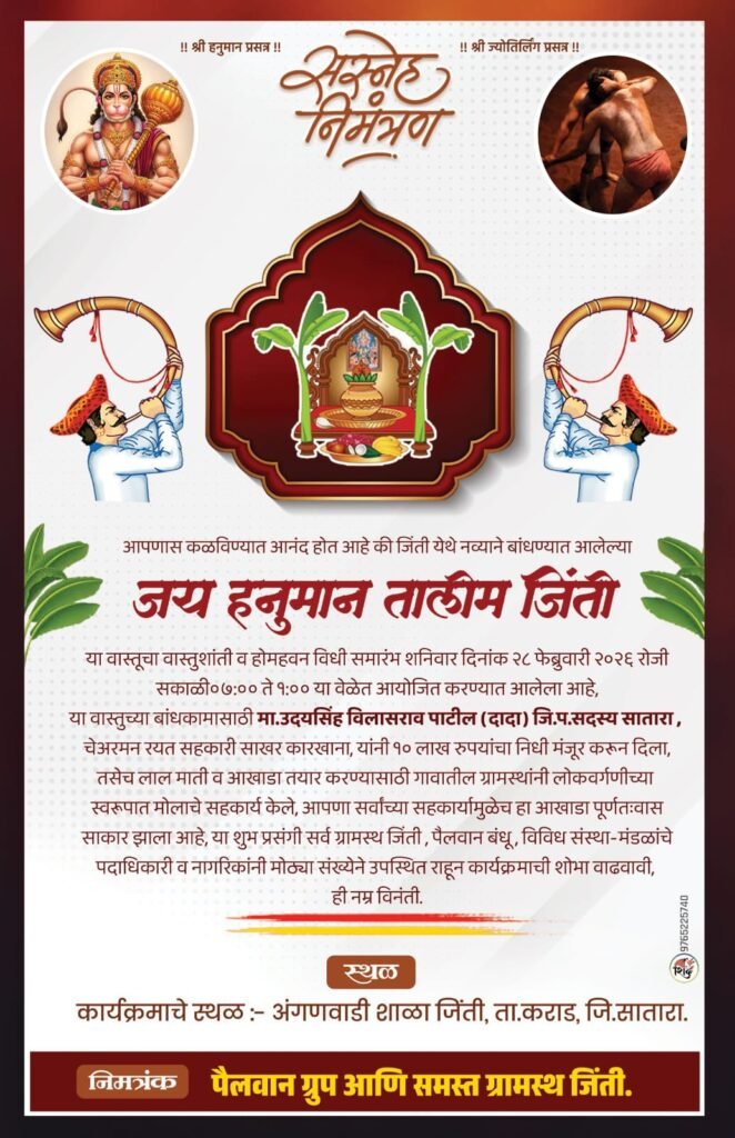 कराड(अमोल पाटील) : कराड तालुक्यातील जिंती येथे नव्याने बांधण्यात आलेल्या जय हनुमान तालीम जिंती या तालीम वास्तूची वास्तुशांती व होमहवन विधीचा भव्य सोहळा शनिवार दिनांक २८ फेब्रुवारी २०२६ रोजी सकाळी ८.०० ते ९.०० या वेळेत आयोजित करण्यात आला आहे. या निमित्ताने गावात उत्साहाचे वातावरण निर्माण झाले आहे.