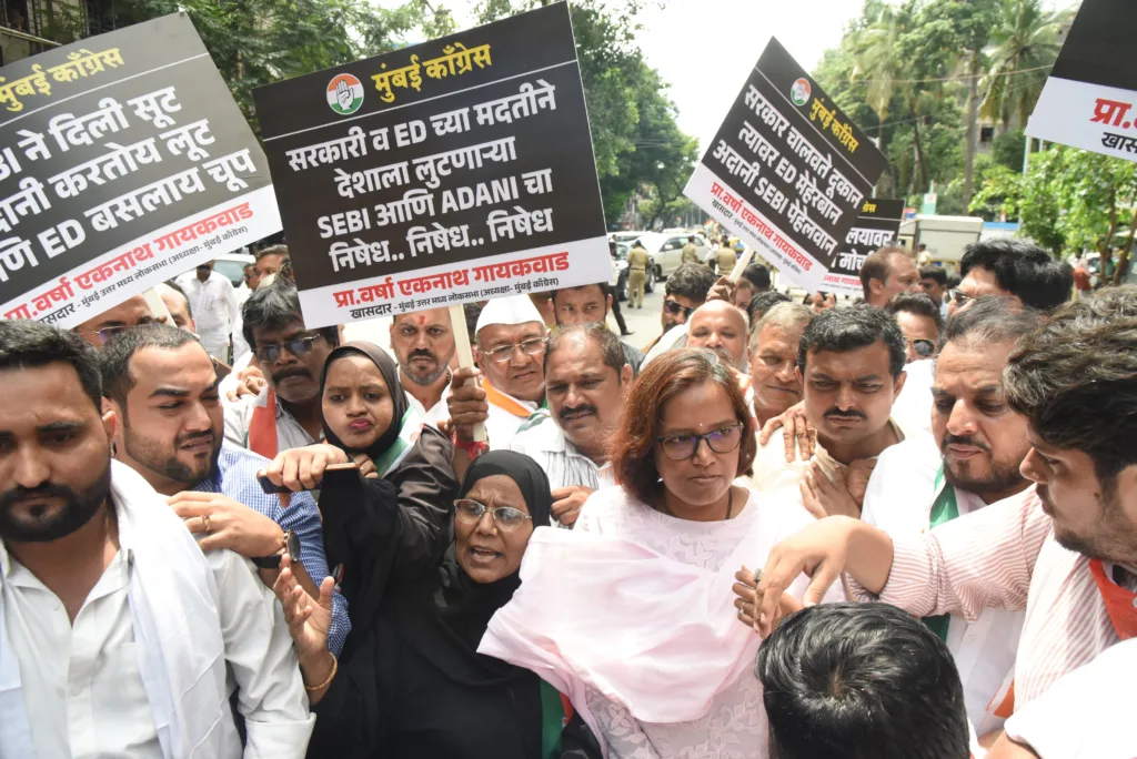 अदानी महाघोटाळ्याची चौकशी ईडीने करावी या मागणी साठी खासदार प्रा. वर्षा गायकवाड यांच्या नेतृत्वाखाली मुंबई काँग्रेसने ईडी ऑफीसवर हजारोंचा मोर्चा काढला. हा मोर्चा अडवण्याचा प्रयत्न पोलिसांनी केला पण कार्यकर्ते हटले नाहीत, त्यांनी रस्त्यावरच ठाण मांडले. यावेळी प्रसार माध्यमांशी बोलताना प्रा. वर्षा गायकवाड म्हणाल्या की, हिंडनबर्गने अदानी कंपनीतील घोटाळा पुराव्यासह उघड केल्यानंतर या घोटाळ्याची चौकशी करण्याची जबाबदारी सेबीकडे देण्यात आली होती पण सेबीच्या प्रमुख माधवी बुच याच या घोटाळ्याच्या लाभार्थी असल्याचे समोर आले आहे मग चोरी करणारा चौकशी कसा करेल. शेअर बाजारात सर्वसामान्य व मध्यम वर्गातील लोकांनी आपल्या कष्टाचा पैसा गुंतवलेला आहे, तोही सुरक्षित राहिलेला नाही. विरोधी पक्षांच्या नेत्यांवर धडक कारवाई करणारी ईडी अदानी कंपनीचा महाघोटाळा उघड झाला तरी त्यांची चौकशी का करत नाही? असा प्रश्न त्यांनी विचारला.
