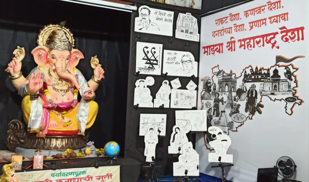 मुंबई, (प्रतिनिधी) काळा किल्ला येथील श्री हनुमान सेवा मंडळाचे यंदाचे ६२ वे वर्ष “म…. माझ्या मराठीचा” या थीमवर गणरायाचे आगळे वेगळे रूप प्रसिद्ध मूर्तिकार पराग पारधी, यांनी साकारलेल्या कागदाच्या लगद्याच्या कलाकृतीतून पहायला मिळते. गणेश मूर्तीचे सुहास्य वदनाने नमस्तक होताना संत शिरोमणी संत ज्ञानेश्वर यांनी संस्कृत भाषेतील गीता ग्रंथाचे प्राकृत मराठी भाषेत म्हणजेच ज्ञानेश्वरीत रूपांतर करताना आपल्या सहाव्या अध्यायात मराठी भाषेला अमृताची उपमा देत माझा मराठीचा बोल कौतुके । परि अमृताते हि पैजा जिंके। ऐसी अक्षरे रसिके । मेळवीन।। असे म्हणत मराठीला अजरामर केले. यातुनच प्रेरणा घेत यंदाचा समाजप्रबोधनपर देखावा साकारताना ‘म… माझ्या मराठीचा’ उत्सवाला पर्यावरणपूरकता असावी म्हणून कागदी लगद्याची मूर्ती तसेच मराठी भाषा टिकवण्यासाठी व मराठी भाषेला अभिजात भाषेचा दर्जा मिळवून देण्यासाठीचा लिहिलेल्या घोष वाक्यांद्वारे देखावा उभारीत ‘म… माझ्या मराठीचा’ चला तर सुरुवात स्वतःपासून करूया.