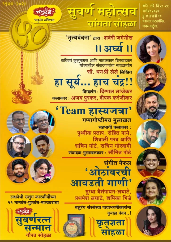 चतुरंग संस्थेच्या पायाभरणीकारांना कृतज्ञ वंदन करण्याच्या समारंभात आणि लक्षवेधी, उत्तुंग कारकीर्दीच्या पं. हरिप्रसाद चौरसिया, पं. उल्हास कशाळकर, श्री. अशोक पत्की, श्री. दिलीप प्रभावळकर, श्री. बाबासाहेब कल्याणी, मेजर महेशकुमार भुरे, डॉ.अनिल काकोडकर, श्री.महेश एलकुंचवार, श्री.वासुदेव कामत, श्रीमती रोहिणी हट्टंगडी, आणि श्री.चंदू बोर्डे या नामवंत, गुणवंत मान्यवरांचा ‘चतुरंग सुवर्णरत्न सन्माना’ ने गौरव होणाऱ्या खास समारंभात विशेष सहभागी म्हणून ॲड. उज्वल निकम, अविनाश धर्माधिकारी, देवकी पंडित, धनश्री लेले, विजय केंकरे, सुहास बहुळकर, श्रुती भावे-चितळे, स्वानंद बेदरकर, आदित्य शिंदे, समीरा गुजर आदी नामवंतांचा समावेश असणार आहे….