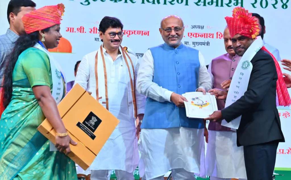 पाटण : महाराष्ट्राचे राज्यपाल सी.पी.राधाकृष्णन यांना पाटण तालुक्यातील डाकेवाडी (काळगांव) येथील शेतीमित्र डाॅ.संदीप डाकवे यांनी अक्षरगणेशाची कलाकृती भेट दिली. डाॅ.डाकवे यांचेकडून भेट दिली जाणारी 15,000 वी कलाकृती आहे. याप्रसंगी उपमुख्यमंत्री अजित पवार, कृषि मंत्री धनंजय मुंडे, आ.अमर काळे, कृषि आयुक्त रविंद्र निबवडे भा.प्र.से., कृषि सचिव जयश्री भोज भा.प्र.से, रेश्मा डाकवे व अन्य मान्यवर उपस्थित होते.