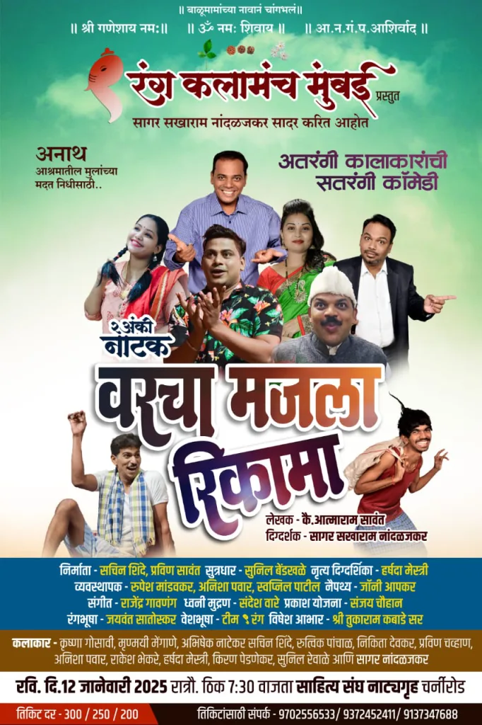 मुंबई – ( शांताराम गुडेकर /दिपक कारकर ) : ९ रंग कलामंच मुंबई गेले अनेक वर्षा पासुन कार्यरत असणारी संस्था पुन्हा एकदा धम्माल विनोदी नाट्यकृती वरचा मजला रिकामा रंगमंचावर घेऊन येत आहे.या नाटकाचे लेखन कै.आत्माराम सावंत तसेच दिग्दर्शन सागर नांदळजकर यांनी केले आहे. प्रविण सावंत आणि सचिन शिंदे यानी या नाटकाची निर्मिती केली आहे.सुत्रधार सुनिल बेंडखळे असून राजेद्र गावणंग यांचे संगीत जयवंत सातोस्करांची रंगभूषा संदेश वारे यांचे ध्वनी मुद्रण तसेच नृत्य दिग्दर्शन हर्षदा मेस्त्री यांनी केले आहे.रुपेश मांडवकर आणि स्वप्नील पाटील व्यवस्थापनाची धूरा सांभाळली आहे.अनेक नावाजलेले कलाकार या नाटकात आपली भूमिका सादर करणार आहेत सदर नाट्यप्रयोग अनाथ आश्रमातील मुलांच्या मदत निधीसाठी होत आहे,तरी सर्वानी रविवार दि.१२ जानेवारी २०२५ रोजी रात्रौ.ठिक ७:३० वाजता साहित्य संघ नाट्यगृह चर्नीरोड येथे या प्रयोगाला मोठया संख्येने उपस्थित रहावे असे आवाहन दिग्दर्शक सागर नांदळजकर यांच्या तर्फे करण्यात आले आहे.अधिक माहितीसाठी – ९७०२५५६५३३ ह्या भ्रमणध्वनी वरती संपर्क साधावा.