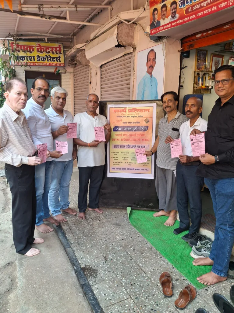 भाईंदर (प्रतिनिधी ) : समर्थ प्रतिष्ठान या भाईंदर मधील सुप्रसिद्ध सेवाभावी संस्थेतर्फे शनिवार दिनांक 25 जाने .रोजी राष्ट्रीय मतदार दिनानिमित्त ओवळा -माजिवडा विधान सभा मतदार संघ १४६ मध्ये मतदार जनजागृती उपक्रम राबविण्यात आला .अध्यक्ष अनिल रानावडे व इतर पदाधिकारी व कार्यकर्त्यांनी मतदारांना आपल्या मतांचं महत्व पटवून देत मतदार नोंदणी करणं किती गरजेचं व कसं करावं या बाबत मार्गदर्शन केले .