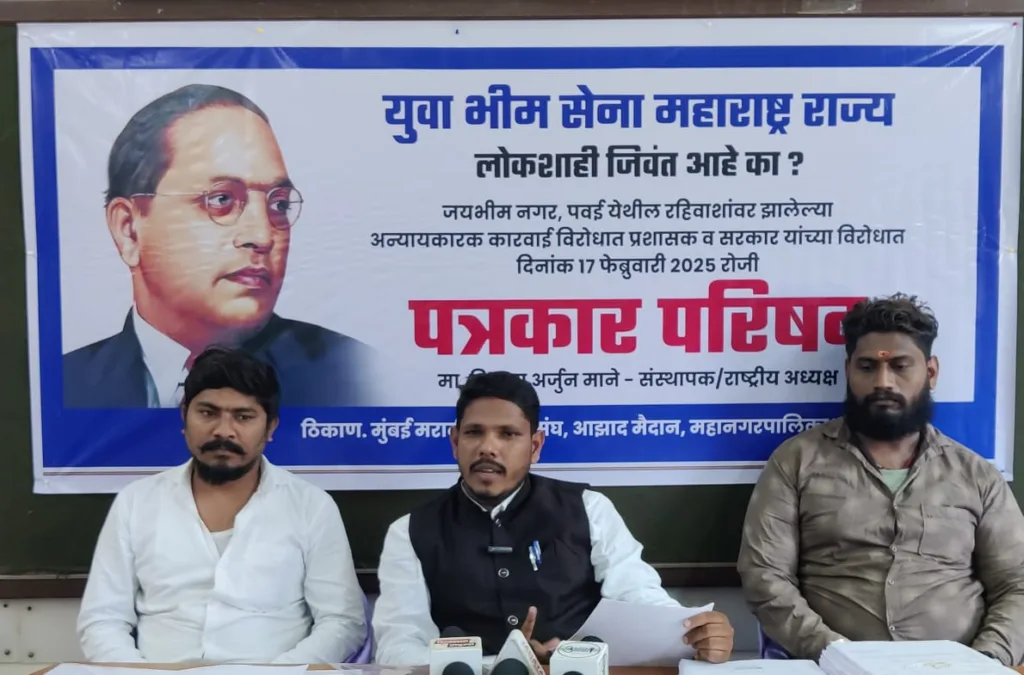 मुंबई(रमेश औताडे) : जयभीम नगर, पवई येथे महापालिकेच्या निष्काळजी कारवाईच्या विरोधात युवा भीमसेना महाराष्ट्र राज्य संघटनेच्या वतीने अध्यक्ष विलास माने यांच्या नेतृत्वाखाली मुंबई मराठी पत्रकार संघात सोमवारी पत्रकार परिषद घेण्यात आली.