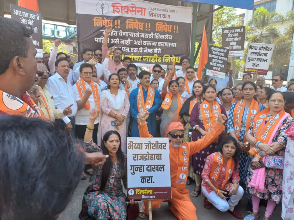 मुंबई (प्रतिनिधी) : मुंबईत मराठी येणे गरजेचे नाही, असे वक्तव्य करणाऱ्या राष्ट्रीय स्वयंसेवक संघाचे माजी सरकार्यवाह भैय्याजी जोशी यांचा जाहीर निषेध करून शिवसेना (उद्धव बाळासाहेब ठाकरे) विभाग क्र.१ तर्फे बोरीवली येथे आंदोलन करण्यात आले. शिवसेना विभागप्रमुख उदेश पाटेकर व महिला विभाग संघटक सौ शुभदा शिंदे यांच्या नेतृत्वाखाली झालेल्या या आंदोलनात उपनेत्या सौ संजना घाडी, माजी नगरसेवक, नगरसेविका, उपविभागप्रमुख, पुरुष व महिला शाखाप्रमुख व शिवसैनिक मोठ्या संख्येने सहभागी झाले होते.