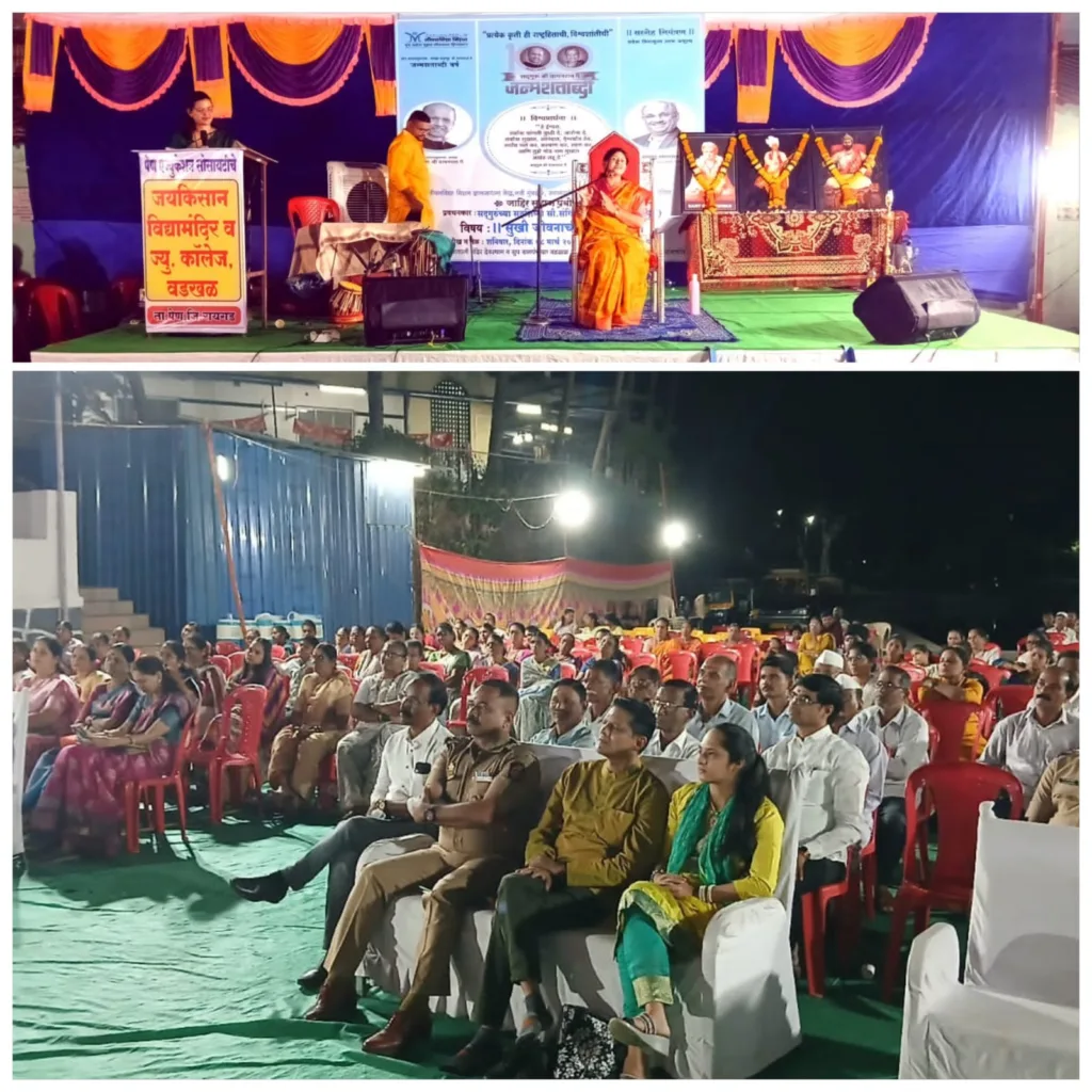 मुंबई (प्रतिनिधी) : तूच आहेस तुझ्या जीवनाचा शिल्पकार असा दिव्य संदेश देणारे सदगुरू श्री. वामनराव पै यांच्या जीवनविद्या मिशनच्या ज्ञानसाधना केंद्र नवी मुंबई २, अंतर्गत स्वानंदयोग साधना केंद्र पेण-अलिबागद्वारे जागतिक महिला दिनानिमित्त सुखी जीवनाची गुरुकिल्ली या विषयावर वडखळ वासीयांसाठी श्री. गणपती मंदिर देवस्थान व ग्रुप ग्रामपंचायत वडखळ ऑफिसच्या मागील तलावाजवळील भव्य प्रांगणात समाज प्रबोधन घेण्यात आले. तब्बल ३५० ते ४०० ग्रामस्थांनी या प्रबोधनाचा लाभ घेतला. संतश्रेष्ठ श्री ज्ञानेश्वर माऊलींच्या सार्थ हरिपाठाने या कार्यक्रमाची सुरुवात झाली. त्यानंतर जीवनविद्या मिशनची सुश्राव्य अशी संगीत जीवनविद्या सादर करण्यात आली. जीवनविद्या मिशनचा सर्वात क्रांतिकारी उपक्रम म्हणजे घरोघरी प्रार्थना जपयज्ञ. हाच उपक्रम २० मिनिटे प्रार्थना जपयज्ञ अतिशय सुश्राव्य व तालबद्ध पद्धतीने कार्यक्रमस्थळी राबविण्यात आला.