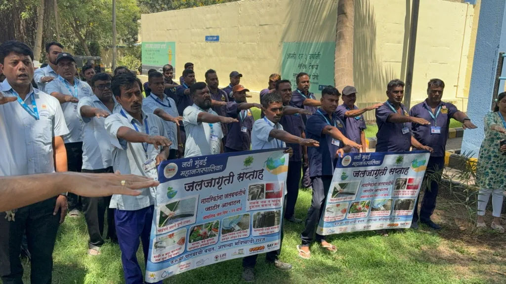 या अनुषंगाने महानगरपालिका आयुक्त डॉ.कैलास शिंदे यांच्या मार्गदर्शनाखाली जागतिक जल दिनाचे औचित्य साधून ‘माझी वसुंधरा’ अभियानांतर्गत विविध विभागांमध्ये जलजागृतीविषयक विविध उपक्रम राबविण्यात आले. महानगरपालिकेचे विविध विभागांमध्ये असणारे जलकुंभ तसेच पम्पींग हाऊस त्याचप्रमाणे मोरबे धरण प्रकल्प व भोकरपाडा जलशुध्दीकरण केंद्र याठिकाणी सामुहिक जलशपथ घेण्यात आली. अतिरिक्त शहर अभियंता श्री.अरविंद शिंदे व इतर अभियंते व अधिकारी, कर्मचारी ठिकठिकाणी मोठ्या संख्येने उपस्थित होते. विशेष म्हणजे यावेळी स्थानिक नागरिकांनीही सहभागी होत जलशपथ घेतली.