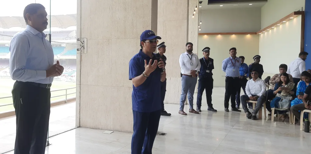 डॉ. डि वाय पाटील स्टेडिअम येथे असलेल्या सचिन तेंडुलकर क्रिकेट अॅकेडमीमध्ये नवी मुंबई महानगरपालिकेच्या शाळांमधील गुणवंत विद्यार्थ्यांना शास्त्रशुध्द क्रिकेट प्रशिक्षण मिळावे यादृष्टीने ॲकेडमीच्या पुढाकाराने देण्यात येत असलेल्या क्रिकेट प्रशिक्षणाच्या यावर्षीच्या शुभारंभप्रसंगी श्री. सचिन तेंडुलकर यांनी उपस्थित शिक्षक, पालक व विद्यार्थ्यांशी संवाद साधला. याप्रसंगी नवी मुंबई महानगरपालिकेचे आयुक्त डॉ. कैलास शिंदे, डॉ. डि वाय पाटील स्टेडिअमचे अध्यक्ष श्री. विजय पाटील उपस्थित होते.