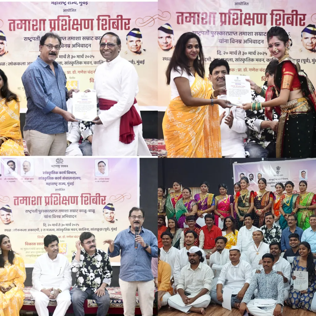 ुंबई (प्रतिनिधी) विविध शिबिरांच्या माध्यमातून परंपरा आणि आपली संस्कृती जपण्यासाठी सांस्कृतिक कार्य संचालनालय विविध उपक्रम राबवित आहे. त्यामुळे या संधीचा फायदा घेवून लोककलेचे प्रशिक्षण घेणाऱ्या विद्यार्थ्यांनी आपली लोककला जतन करावी. त्याचे संवर्धन करावे. असे मार्गदर्शन शनिवार (ता. 29) तमाशा प्रशिक्षण शिबिरात सहभागी झालेल्या विद्यार्थ्यांना मान्यवरांनी एका शानदार समारोप समारंभात केले.