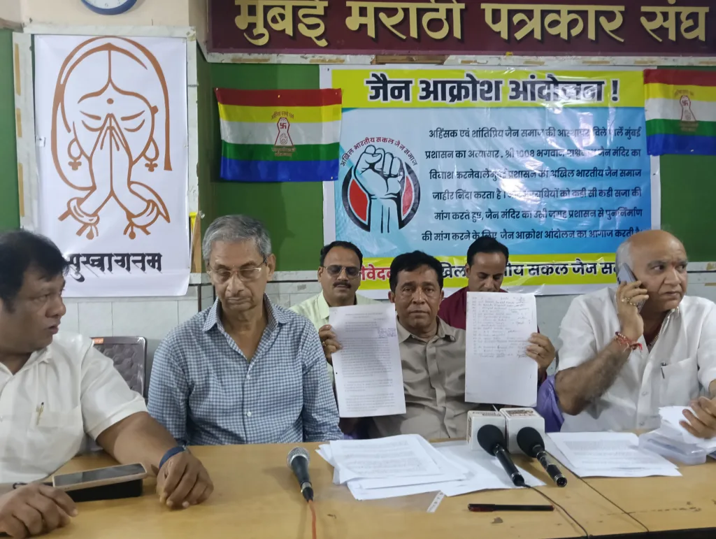 प्रतिनिधी (भीमराव धुळप) : मुंबई विलेपार्ले येथील १९३५ साली बांधकाम केलेले १०८ पार्श्वनाथ जैन मंदिर मुंबई महानगर पालिकेने तोडल्याने अखिल भारतीय सकल जैन समाज संतप्त झाला असून,शनिवारी १९ एप्रिलला सर्व जैन समाजाच्या वतीने विलेपार्ले ते अंधेरी येथील के. एल महानगरपालिका पर्यंत आंदोलन करणार असल्याचे मुंबई मराठी पत्रकार संघ येथे शुक्रवारी झालेल्या पत्रकार परिषदेत ” सांगितले.