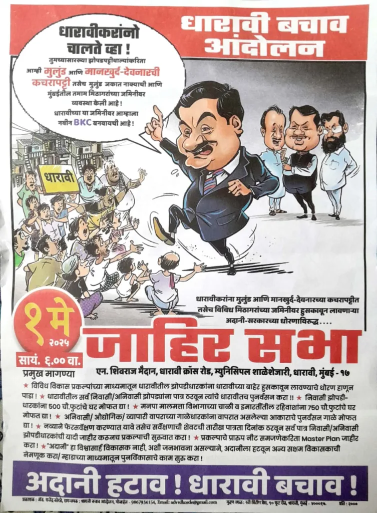 धारावी : १ मे २०२५ – धारावी बचाव आंदोलनाच्या वतीने एक अतिमहत्त्वाची जाहीर सभा गुरुवार, दिनांक १ मे २०२५ रोजी संध्याकाळी ६ वाजता, एन. शिवराज मैदान, संत कक्कया मार्ग, क्रॉस रोड, मुन्सिपल शाळेजवळ, धारावी, मुंबई १७ येथे आयोजित करण्यात आली आहे.