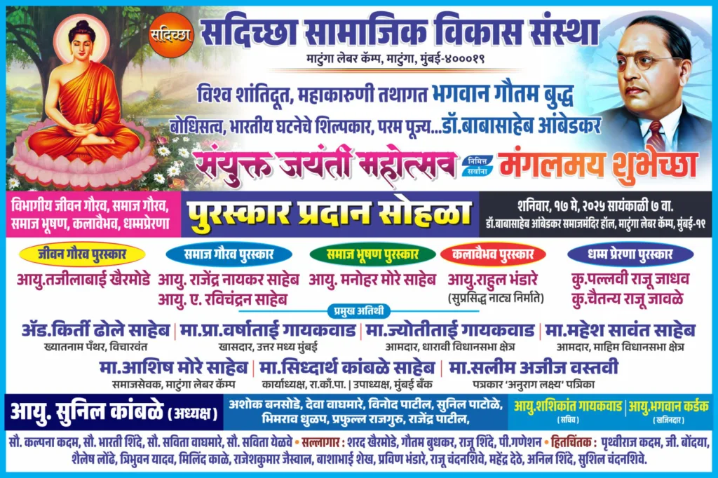 प्रतिनिधी, मुंबई – धारावी माटुंगा विभागातील सामाजिक व शैक्षणिक कार्यात अग्रस्थानी असलेल्या सदिच्छा सामाजिक विकास संस्था ही गेली १० वर्षे विविध क्षेत्रांमध्ये उल्लेखनीय कार्य करणाऱ्या व्यक्तींना सन्मानित करत आली आहे. याच परंपरेनुसार यावर्षीही संयुक्त जयंती महोत्सवानिमित्त पुरस्कार प्रदान सोहळ्याचे आयोजन करण्यात आले आहे.