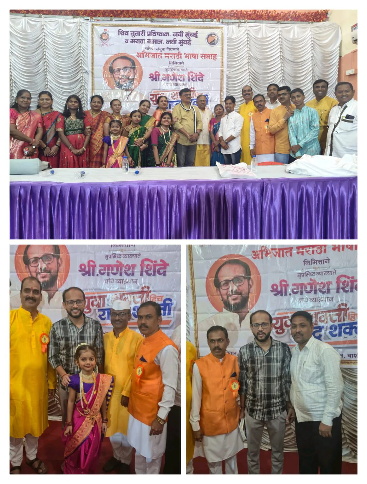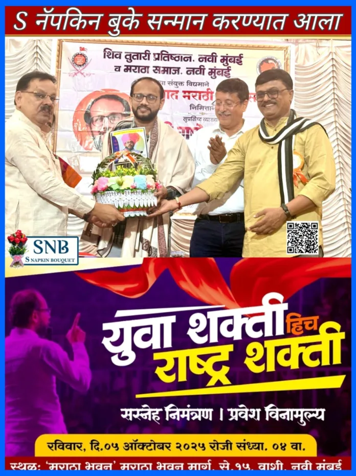 नवी मुंबई – तंत्रज्ञानाच्या युगातही आपल्या संस्कृतीची जोपासना करण्याचा व कौटुंबिक ऐक्य राखण्याचा संदेश युवा प्रबोधन व्याख्याते गणेश शिंदे यांनी उपस्थित श्रोते युवक-युवतींना दिला. त्यांनी सांगितले की, आपल्या वागण्याचे अनुकरण मुले करत असतात; त्यामुळे पालकांनी सदैव चांगले सुसंस्कार निर्माण होईल याची काळजी घ्यावी.शिव तुतारी प्रतिष्ठान नवी मुंबई आणि मराठा समाज नवी मुंबई यांच्या संयुक्त विद्यमाने मराठा भवन, वाशी येथे मराठी भाषा अभिजात सप्ताह निमित्त विशेष कार्यक्रमाचे आयोजन करण्यात आले होते. प्रमुख मान्यवर म्हणून गणेश शिंदे यांना निमंत्रित करण्यात आले होते. कार्यक्रमाची सुरुवात आई तुळजाभवानी, मासाहेब जिजाऊ, तसेच छत्रपती शिवाजी महाराज यांच्या प्रतिमेला पुष्पांजली व दीप प्रज्वलन करून करण्यात आली.कार्यक्रमात प्रा. रवींद्र पाटील सर आणि अमरजा चव्हाण मॅडम यांनी संस्थांचा आढावा घेतला व सांगितले की, या माध्यमातून महान वक्त्यांचे प्रबोधनात्मक विचार जनसामान्यांपर्यंत पोहोचविण्याचे कार्य केले जाते. तसेच, दोन्ही संस्थांच्या वतीने पूरग्रस्तांना मदत निधी देण्याची घोषणा केली.पर्यावरण पूरक S नॅपकिन बुके, शाल आणि राजमुद्रा प्रतिमा भेट देऊन गणेश शिंदे यांचा शिव तुतारी प्रतिष्ठान आणि मराठा समाज यांच्या पदाधिकाऱ्यांच्या हस्ते सन्मान करण्यात आला. कार्यक्रम सुरू होण्यापूर्वी कविता डॉट कॉमच्या नारायण लांडगे, शंकर गोपाळे, रुद्राक्ष पातारे यांनी रसिक श्रोत्यांचे मन जिंकले. उपस्थित विद्यार्थ्यांनी स्वयंसेवकाची जबाबदारी उत्कृष्टरीत्या पार पाडली.कार्यक्रमाचे सूत्रसंचालन जनसंपर्क अधिकारी महेंद्र कोंडे यांनी केले, तर आभार वसंत तरडे यांनी मानले. यशस्वी आयोजनासाठी श्याम महाडिक, सुलेखनकार समेळकाका, श्रीहरी पवळे, रेखा कदम, अजय वाळुंज, निलेश पालेकर, कृष्णा सावंत, रमेश संकपाळ, राजेंद्र मोरे, वसंत जाधव, कल्पना देशमुख, सुनंदा राणे, भिमराव धुळप, श्री.प्रकाशनाईक,प्रणाली कदम,छाया मोरे,मालिनी घाग,शशिकांत सुर्वे,विजय देशमुख आणि इतर सहकारी यांनी मेहनत घेतली.कार्यक्रमाचा समारोप बालकवी प्रसाद माळी आणि त्यांच्या टीमने पसायदान बोलून केला. कार्यक्रमामध्ये उपस्थित सर्वांनी मराठी भाषेच्या अभिजाततेचा अनुभव घेतला व संस्कृती जपण्याचे संकल्प व्यक्त केले.