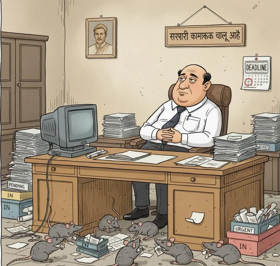 फायलींना कुरतडणारे दात, टेबलावर गाजविणारे अधिकार, अन टेबलाखाली सळसळणारी या “मूषक मंडळा”ची संघटीत मोर्चे बांधणी दररोज एक नव्या खेळाचा डाव रंगवत असतात. सर्व सामान्य जनतेच्या कामापेक्षा उंदराच्या शेपटीची अधिक हालचाल दिसते. यामुळे हा उंदरांचा खेळ की,मंत्रालयातील प्रशासन व्यवस्थेची हार आहे.असा प्रश्न सामान्य जनतेला पडल्याशिवाय राहत नाही.