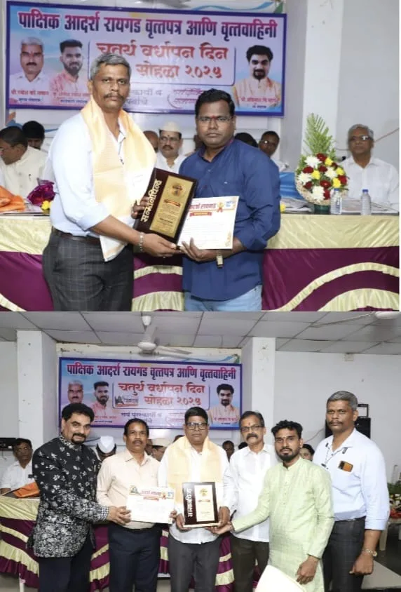 मुंबई (शांताराम गुडेकर) : मराठी अस्मितेचा मानबिंदू, रोखठोक वर्तमानपत्र “आदर्श रायगड” या वृत्तपत्र व वृत्तवाहिनीच्या ४थ्या वर्धापन दिनानिमित्त रविवार दिनांक १२ ऑक्टोबर २०२५ रोजी अंबरनाथ येथील अंबर रोटरी भवन येथे आयोजित राज्यस्तरीय पुरस्कार सोहळ्यात घाटकोपर येथील शिवसेना ग्राहक संरक्षण कक्ष घाटकोपर पश्चिम विधानसभा संघटक,मायेची सावली एक हात कर्तव्याचा संस्थापक अध्यक्ष श्री.यशवंत विठ्ठल खोपकर यांना सामाजिक कार्य क्षेत्रातील कामगिरीसाठी “समाज रत्न पुरस्कार-२०२५ मान्यवरांच्या शुभहस्ते स्वीकारला. तसेच आदर्श सामाजिक संस्था म्हणून शिवसेना उध्दव बाळासाहेब ठाकरे प्रणित मायेची सावली एक हात कर्तव्याचा या संस्थेला “आदर्श सामाजिक संस्था पुरस्कार -२०२५ प्रदान करण्यात आलेला पुरस्कार, संस्थेचे अध्यक्ष श्री. यशवंत खोपकर ,दौलत बेलेकर, वसंत घडशी, राजेंद्र पेडणेकर,आणि अन्य पदाधिकारी, सदस्य यांनी स्वीकारला.यावेळी व्यासपीठाव ह.भ.प.उमेश महादेव शेडगे, ह .भ .प. रघुनाथ दादा मोरे,तुळशीराम चौधरी( नगरसेवक ),कृष्णा कदम (केके )संस्थापक अध्यक्ष वैद्यकीय मदत कक्ष,प्रेरणा वैभव गावकर (प्रेरणा फाउंडेशन संस्थापक /अध्यक्ष),